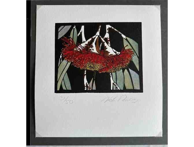 Original limited edition hand colored linocut by Australian artist, Vida Pearson. Edition 31/50. Approximately 9"x9", unframed.