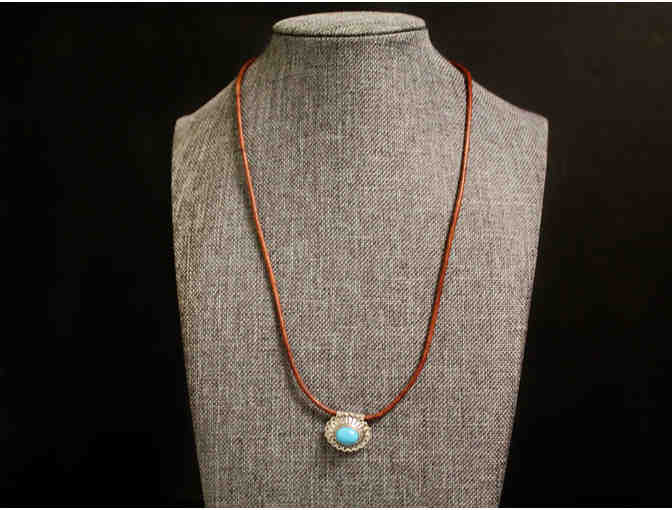 This handcrafted sterling silver and turquoise pendant necklace features a pewter button clasp and 18" tan leather "chain". A perfect accessory for your wardrobe!