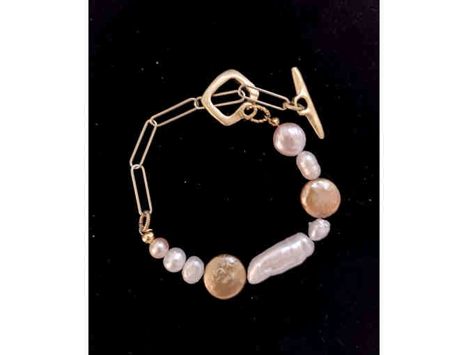 This handcrafted bracelet is just lovely! This bracelet is 8 1/4" long and features pearls, with a gold chain and a toggle clasp for ease in putting on and taking off - the perfect addition to your jewelry collection!