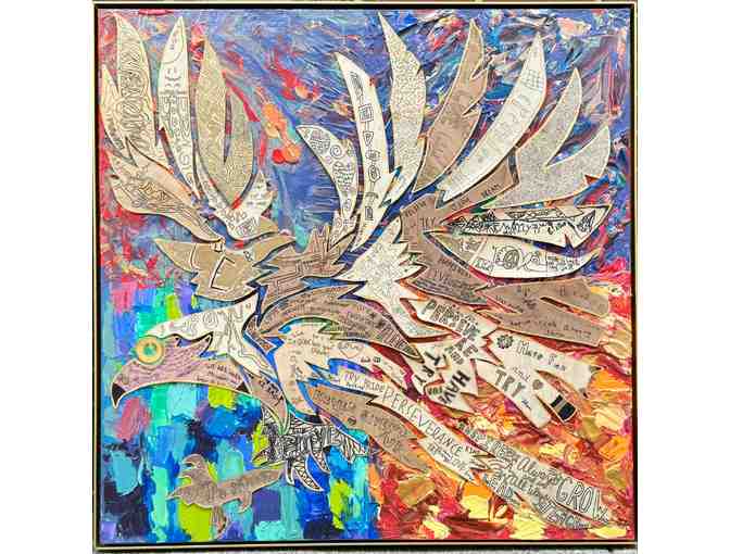 A 36”x 36” painted canvas with wood veneer hawk pieces.