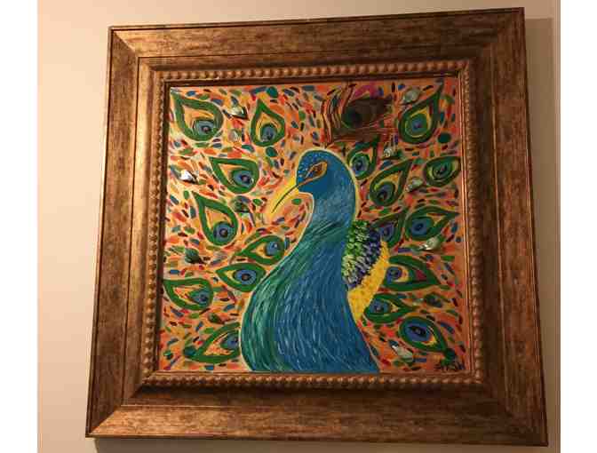 The painting is a refurbished acrylic painting. This piece has a golden antique frame and took many weeks of hard work and determination. This is a peacock painting and it represents beauty and wealth. The feather in the painting is a real peacock the artist got from India. Peacocks are the national bird of India with many colors which inspired him to make this painting. This original piece is sure to add beauty, inspiration and color to your home!