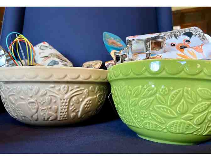 Make time spent in the kitchen a beautiful memory with this baking set. The exquisite woodland-themed baking bowls will enthrall your children, please an adult aesthetic, and make a stunning addition to any kitchen.  Find all the goodies you need for a sweet creative time together: a woodland-themed adult cafe apron, a children's sized apron, cookie cutters, a wood-burned spatula, a spoonula, a rainbow whisk and two woodland-themed dish towels
