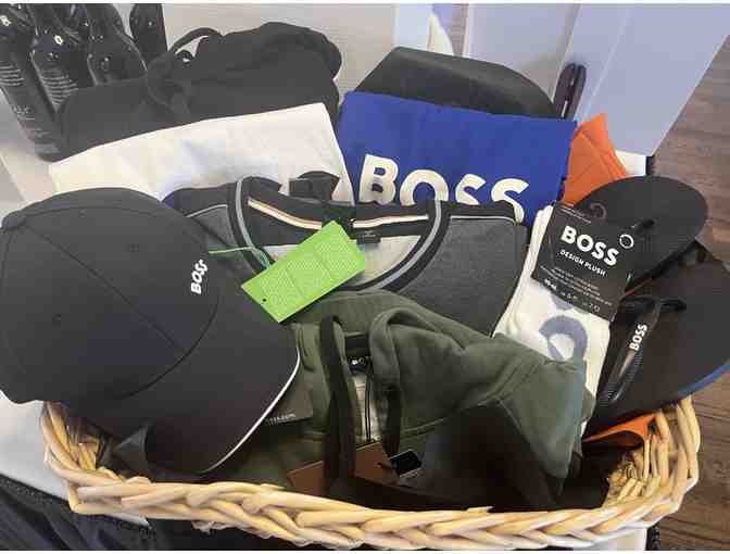 Basket of Hugo Boss streetwear featuring two hoodies, tee-shirts, socks, shorts, flip flops and shorts. This high-quality clothing will make you feel like a Boss!