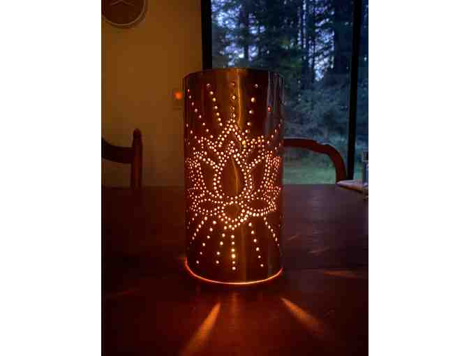 The 4th grade class created three “Transformation and Renewal” themed copper luminaries. This auction is for the Lotus Luminary only.