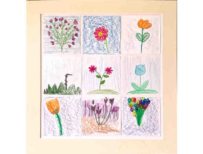 Collection of crayon and colored pencil flower drawings by the 2nd grade class.