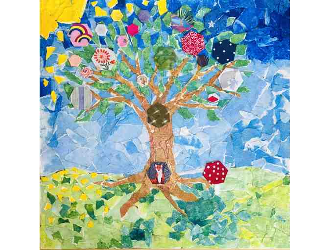 This piece was created using Dragonfly Kindergarten napkin fabrics and their water-colored paintings. Large hexagons are fabrics of students who will be going on to First grade next year, and the smaller ones belong to the returning kindergarten students. The picture was formed by the loving hands of the Makaryk family.