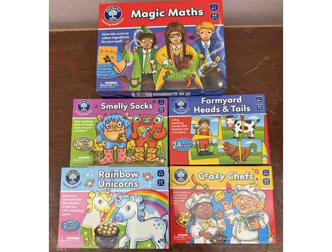 Game collection for 3 to 7 years old, featuring five titles from Orchard, the UK's classic game maker. Perfect as a gift or for your own collection. Rainbow Unicorns, Crazy Chefs, Farmyard Heads & Tails, Magic Maths, Smelly Socks