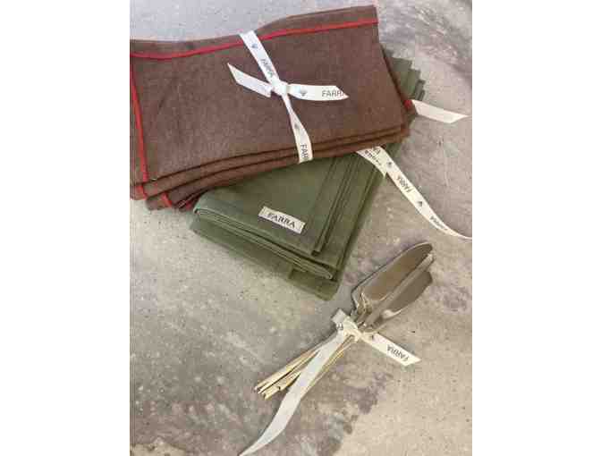 From the Farra line of high end home decor, these sets of upcycled linen napkins are hand dyed and finished anoverlock hem in flame. Also includes 5 demitasse, hand-forged, bronze unlaquered knives.