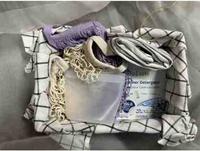 Use less plastic! Environmentally sustainable basket. Includes 60 dishwasher tabs from Truearth. 2 kitchen towels, 2 cotton net bags, and a solicone storage bag. Wrapped in silk -- not plastic