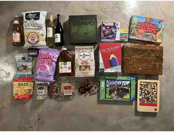 Pre-loved games and puzzles for all ages, including Pictionary, Snap it, Jumanji, Dinosaur Escape, and More. Snacks and beverages for all ages, including popcorn, chips & salsa, nuts, dried fruit, 2 bottles of wine, juice & more.