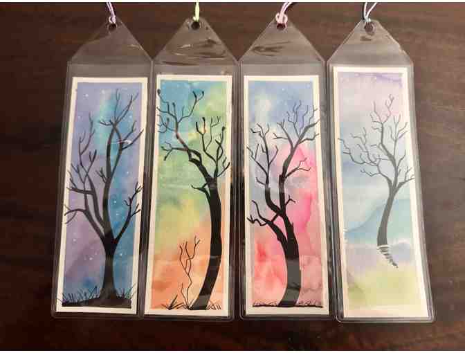Add some beauty to your reading experience with these hand painted bookmarks. 4 OCS Parent painted winter tree themed bookmarks in plastic sleeves for protection.
