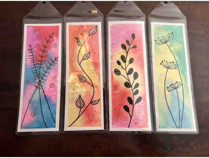 Add some beauty to your reading experience with these hand painted bookmarks. 4 OCS Parent painted whimsical plant themed bookmarks in plastic sleeves for protection.