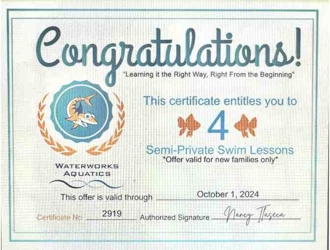 The certificate is for one package of four semi-private swim lessons ($116 value).