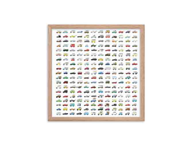 18" x 18" framed print of 300 illustrated "Rad cars with Rad Surfboards" on them. Drawn by Kevin Butler