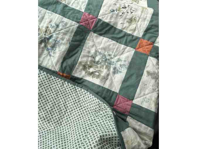 This beautiful quilt has love poured into every piece and layer. Each of the organic linen squares was designed by a child in Mr. Winter’s first grade class. The children made a design on their square out of fresh florals and hammered them into the fabric. The natural pigment from the leaves and petals dyed the linen. Each square is unique and special, as is each child. The parents collaborated in every way, from cutting the fabric, to delivering the florals, to assisting the children, to then taking all the pieces and creating this one-of-a-kind heirloom quilt.