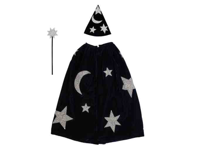 Meri Meri wizard velvet costume with silver glitter fabric stars and moons Sutiable for ages 3-6. Includes blue velvet hat, cape and wand