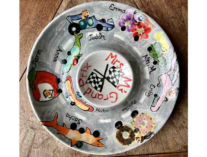 She said, "The children and I looked at the shape of the chip and dip bowl together and decided that it would make a perfect speedway. They then shared with me which imaginative and funny car they wanted to be depicted as driving. And of course, we had to get Mrs. Mazzella in the mix! Their fingerprints were used both for the little drivers and the cars, while I painted in the details. I hope you will enjoy this chip and dip platter as a memory of this wonderful class and this special period of their and your lives."