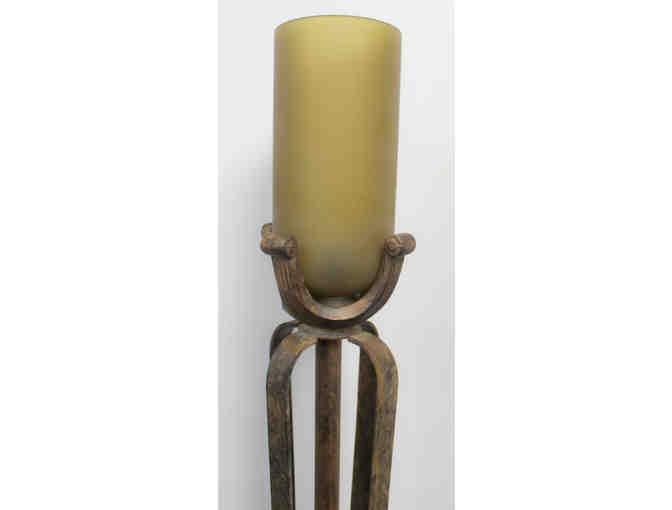 This rustic-art-deco torchiere floor lamp comes from an antique furniture store in Jupiter, Florida. The faux bronze finish goes with many styles. It stands over six feet tall and has a base about a foot wide and a narrow body. The frosted glass lampshade and the dimmer control with a long cord give the lighting a muted glow. The lamp is a gorgeous piece of art that would look exquisite in the corner of the room and add just the right amount of extra light. You're sure to have many compliments at a fraction of the cost.