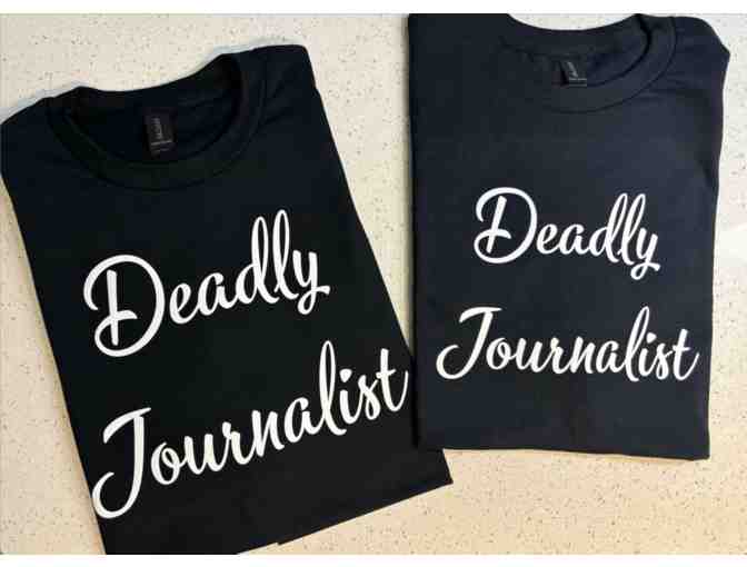 A black T-shirt with Deadly Journalist printed on the front. This t-shirt is a size extra large.