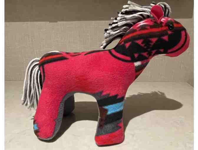 Pink pony made from soft material with Indigenous designs on the fabric. Item was sewn by Diné fabric artist.