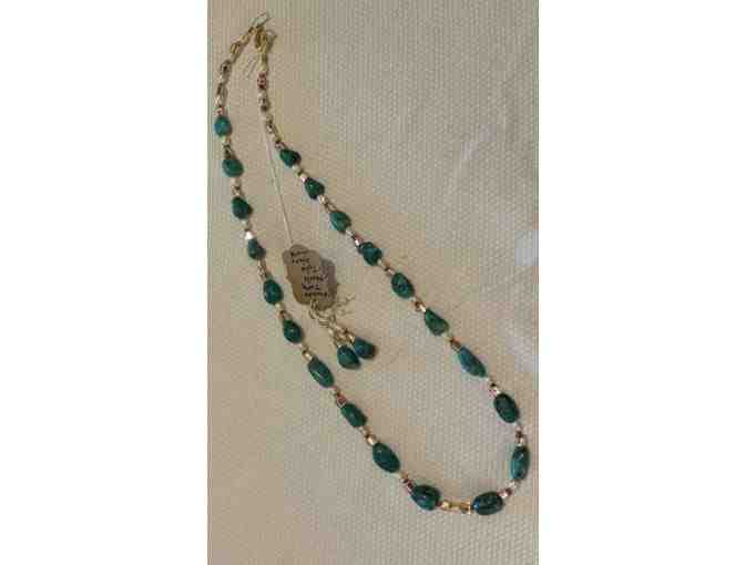 Handmade matching earrings and necklace set made from turquoise, pearls and Toho glass, with gold toned metal.