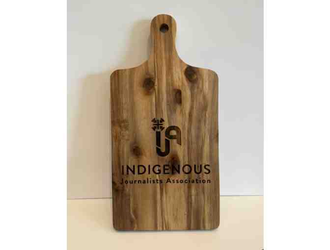 A wooden board that could be used as a cutting or charcuterie board with IJA Logo burned into the surface.
