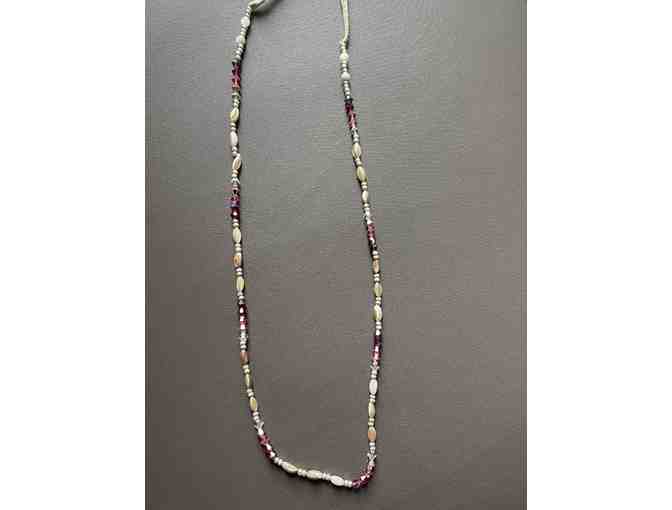 Long necklace with pink and purple glass beads, and irridescent long beads on a white leather cord.