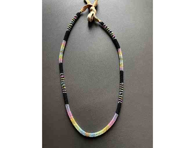 Beaded rope necklace on a leather chain with black and pastel rainbow beads
