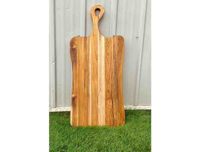 These boards are made from food-grade teak wood that has been glued into panels. The panels are cut to shape, sanded, and finished. The boards are finished with a food-safe finish to prolong their life.