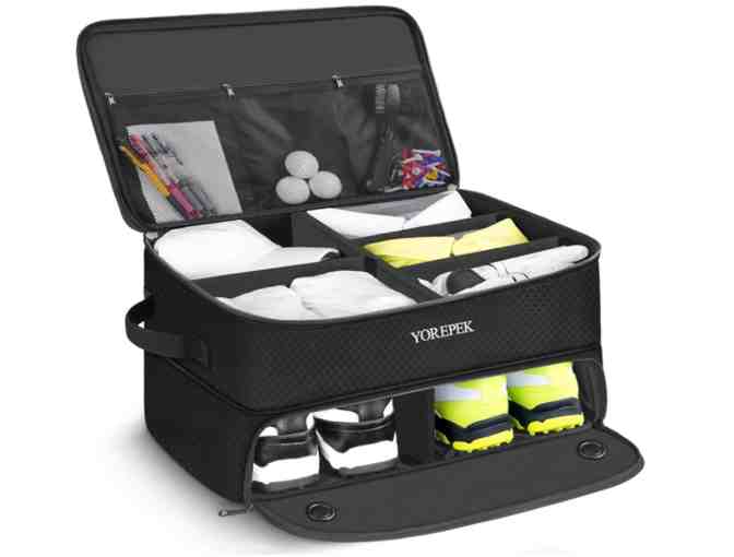 • SEPARATE STORAGE FOR 2 SHOES YOREPEK: golf trunk organizer for car is upgraded on storage compartments, having separate shoes compartment on the bottom layer, to store 2 pairs of shoes up to size 14 The bottom compartment is with ventilated holes to keep air flowing around shoes; And the bottom storage space is made of polyester, which is easy to clean.