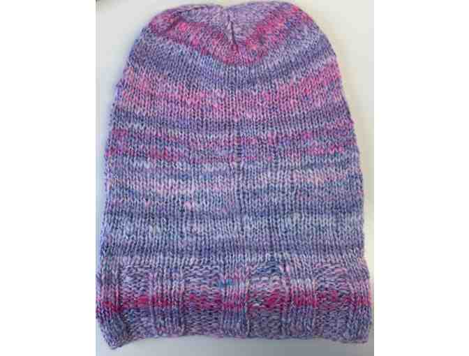 Handmade beanie measuring 15” in circumference (will comfortably fit adult head up to 23” in circumference) and 10” tall – the height gives a nice slouchy effect. Yarn is a unique hand spun, soft wool/silk blend from Robin Pascal (fiber artist from New Mexico). I picked this yarn up at the Kingshighway Library which has a ‘yarn’ library and a great place to find treasures. I wanted to keep the pattern simple, so the hand spun effect is highlighted. Pattern by Sara’s Texture Crafts and created by Deepa Balasubramanian who is a passionate knitter.