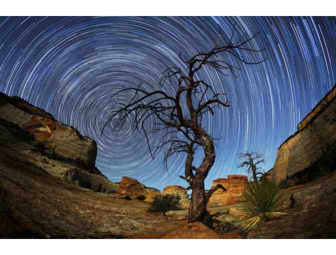 A long exposure star trail photograph of the night sky behind a particularly gnarly tree on Checkerboard Mesa in Zion National Park, Utah.