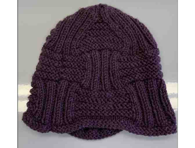 Handmade hat measuring 18” in circumference (will comfortably fit adult head up to 26” in circumference) and 8” tall. Horizontal and vertical strips create a fun textured look in a deep eggplant color. Created by Deepa Balasubramanian who is a passionate knitter.