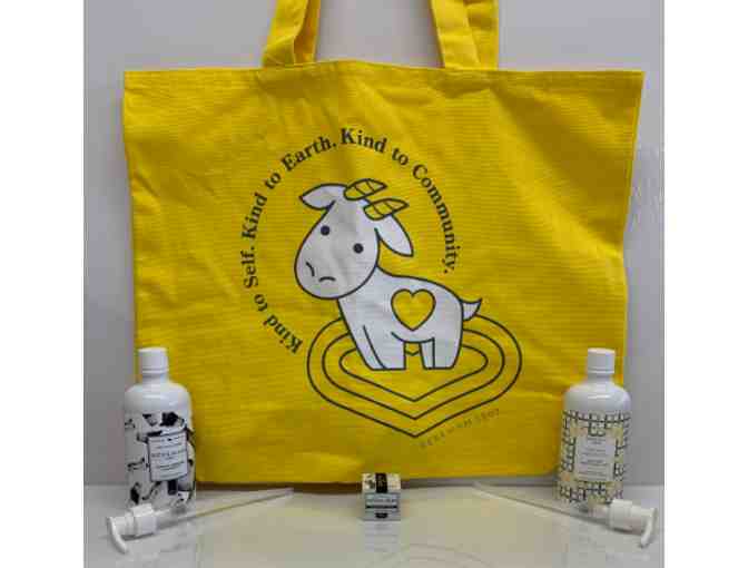 This set includes one 12.5oz bottle of hand and body wash, one 12.5oz bottle of goat milk lotion, one jar of cuticle cream, and one tote bag.