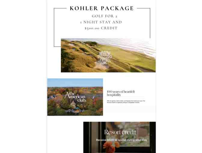 This is your chance to escape to luxury with this Kohler Resort Package! Enjoy a round of golf for two at one of the premier courses, followed by a relaxing overnight stay at the beautiful resort. Whether you're hitting the green or hitting the spa, you'll be pampered with a $500 credit to use toward dining, spa treatments, or other resort activities.