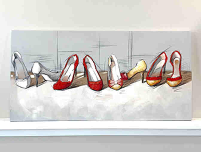 This original oil painting on canvas features a striking array of high-heeled shoes displayed across a neutral gray background. The artwork, 24" H x 48" W, showcases a spectrum of color, with the central focus being on two pairs of bold red shoes. Flanking them are shoes in softer tones—grays and yellows—that add depth and balance to the composition. The brushstrokes and shading bring a sense of texture to the shoes, while the gray background enhances the vibrant colors, creating a dynamic yet elegant contrast. The playful yet refined arrangement invites the viewer to reflect on personal style and identity.
