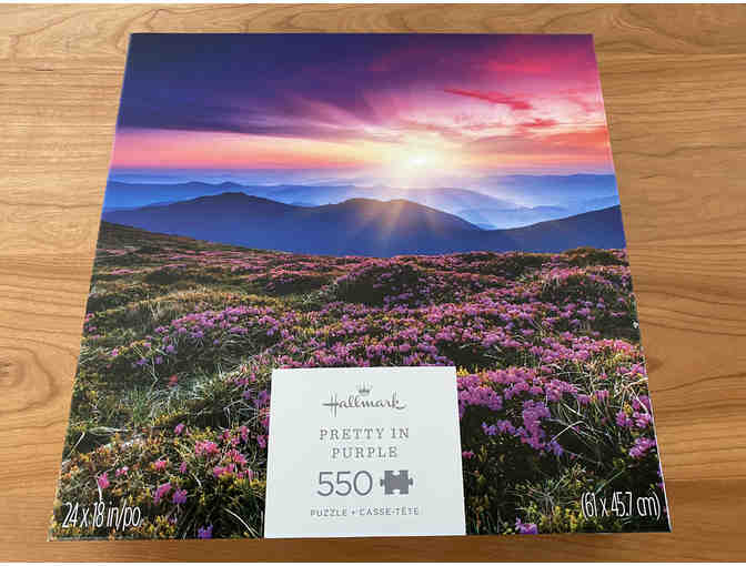 A 550-Piece Hallmark Puzzle, "Pretty in Purple," is included with the puzzle board. It depicts a range of mountains that look shades of purple and blue as the sun sets over them in a brilliant rainbow of colors -- purple, pink, yellow and orange. In the foreground is a hill covered with bushes abounding with pink blossoms. This puzzle will be lots of fun for your family to do together!