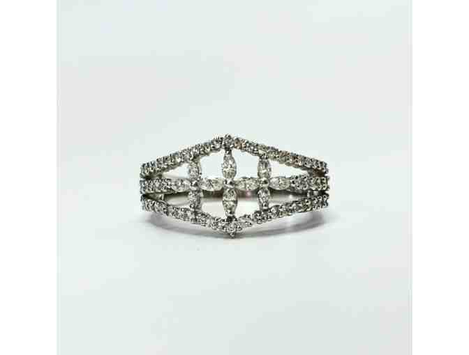 Enjoy this 18K white gold fashion ring featuring both brilliant round cut and marquise shaped diamonds from Adler's.