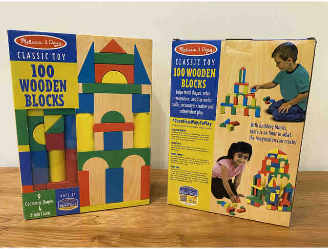 Here are two boxes of Melissa and Doug solid-wood building blocks (200 blocks in all!) in 4 colors and 9 shapes, plus a colorful carrying/storage bag. The brightly colored wooden building blocks make a great gift for toddlers and preschoolers, ages 2 through 5, for hands-on, screen-free play. Ideal for building and for introducing early math concepts, these blocks are perfect for hours (and towers) of fun!
