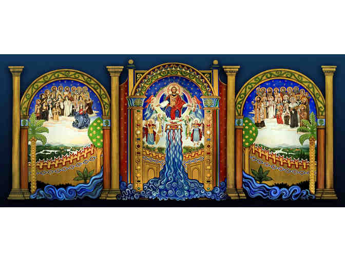 Painted in a three-panel triptych equaling an overall size of 60 feet wide by 25 feet high, the work is displayed in the gymnasium for all school Masses. It depicts Christ seated on the throne of God surrounded by the Heavenly Host, including the Archangels, and a multitude of Saints, with water and blood gushing forth from Christ’s wounds signifying the birth of the Church and the healing power of the Sacraments.
