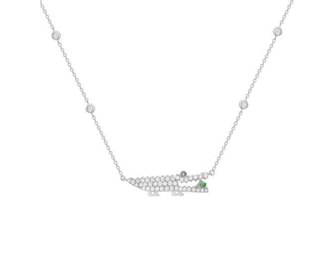 The first piece designed by Porter Lyons for the Alligatorea collection, this unique statement necklace features an alligator crafted with scattered diamonds clutching baguette emeralds in its mouth. An edgy but elegant piece on dainty chain with six bezel-set diamonds and an emerald eye.