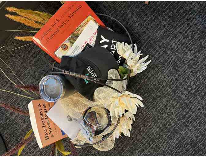 This beautifully curated basket is a perfect gift for art and history enthusiasts, featuring exclusive passes to three renowned museums in Flathead County including Conrad Mansion, Hockaday Museum of Art, and the Northwest Montana History Museum. Included are delightful items from the Hockaday Museum of Art, such as a stylish tote bag, a trendy hat, and a charming coffee mug, each showcasing the museum's artistic flair. To enhance your experience, an insulated coffee mug from the Conrad Mansion, elegantly engraved with the historical site, adds a touch of local heritage. Rounding out this impressive collection are two captivating books that delve into the history behind some of Montana's most beloved sights. This basket is not just a gift; it’s an invitation to explore and appreciate the rich cultural tapestry of the region.