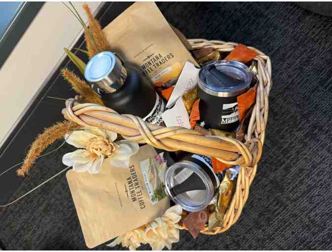 Start your mornings with a touch of Montana! This basket includes two delicious blends from Montana Coffee Traders to kick off your day. Keep your coffee steaming hot with two premium insulated mugs, and stay hydrated with a matching water bottle for when you're on the go. Plus, enjoy a sweet treat or a savory bite with two gift cards to Bonjour Bistro – the perfect spot for a tasty pick-me-up!
