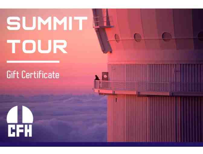 This certificate entitles up to four adults (16 years and older) to a tour of the CFHT headquarters in Waimea, dinner at the mid-level facility on the slopes of Maunakea followed by a sunset tour of the Canada-France-Hawaii observatory on Maunakea. The actual date to be agreed upon by a single individual designated to speak for the tour group and Canada-France-Hawaii. Transportation provided from Canada-France-Hawaii, Waimea office. Expiration date: November 2025