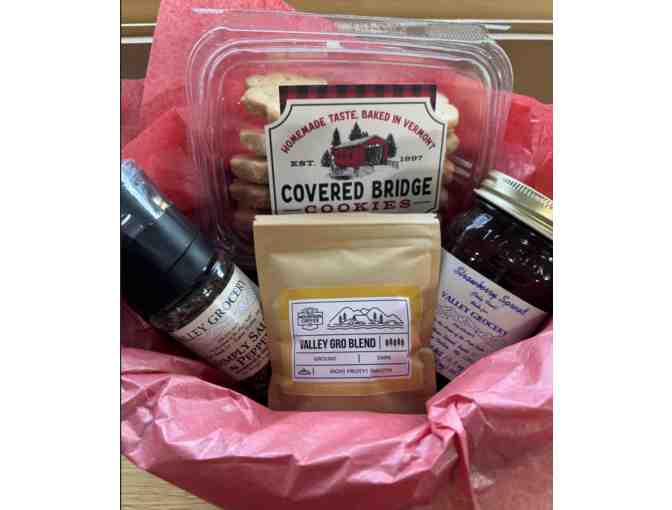 Great basket for the holidays or as a gift! This includes Old Mountain Coffee 2oz., Strawberry Spread, Salt and Pepper grinder, and Covered Bridge cookies.
