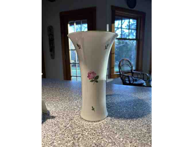 Porcelain vase was made in Vienna, Austria by the Augarten Porcelain Manufactory. Viennese Rose Pattern. It is a numbered piece. 10" inches tall.