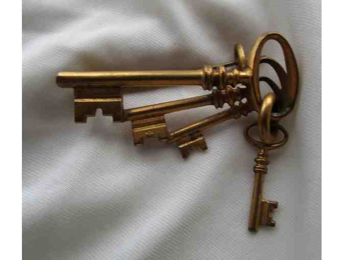 Antique Metallic brooch, no markings. 1 3/4 in by 1 3/4- littlest key dangles and moves. No provenance.