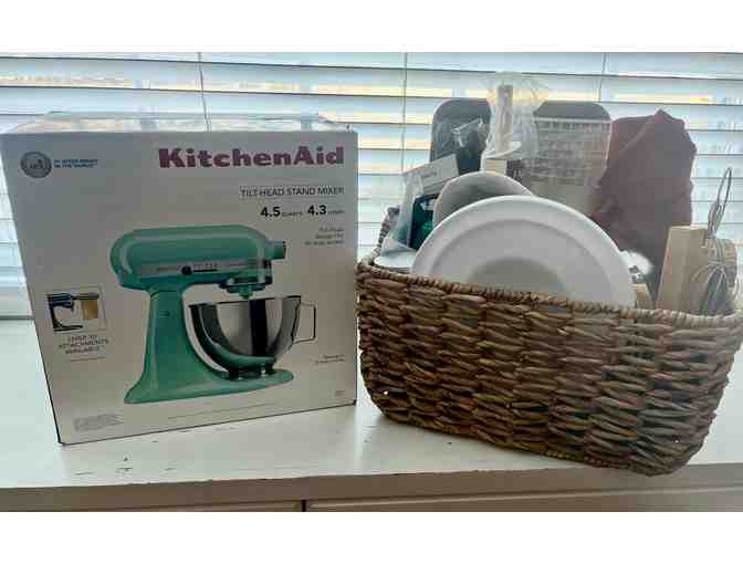 To elevate your baking journey, this basket is also adorned with a selection of stainless steel mixing bowls, baking sheets, and cooling racks. We have also included a complete sourdough starter kit and several cast iron pieces to help enhance your baking journey. A KitchenAid mixer rounds out the items in this fabulous basket. Known for its durability and versatility, this iconic kitchen appliance can handle various tasks, from mixing dough to whipping cream. Whether you're baking a cake or preparing a batch of cookies, a KitchenAid mixer can save you time and effort in the kitchen.