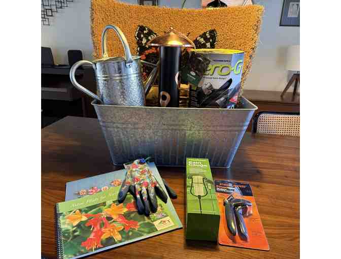 Give your garden a Green Thumbs Up with this beautifully curated basket from local Merrifield Garden Center. It's perfect for both seasoned gardeners and aspiring plant lovers alike! Stay equipped with garden gloves, pruners, and a stylish watering can. The black copper bird feeder brings charm and wildlife to your space, while the Zero-G 50ft lightweight, kink-free hose and rain gauge help keep your plants thriving. A stylish butterfly coir door mat keeps the mess outside and a copy of Native Plants of Northern Virginia, 4th Edition will inspire you to plant for pollinators. With even more surprises, this basket is sure to help your garden flourish!