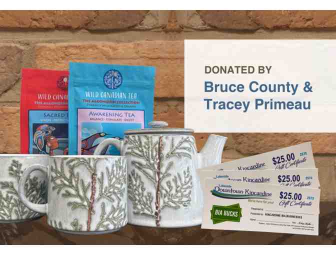 Sip, relax, and enjoy with this elegant teapot and matching mug set featuring a delicate evergreen branch design in a soft off-white/light grey color. Complete with two types of tea and $75 in BIA Bucks, this set is perfect for cozy moments at home.